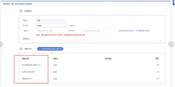 4. 填写退费相关信息,生成退还账户确认书,上传当事人身份证明,授权委托书等材料,并提交,完成网上退费申请操作。如下图所示:
